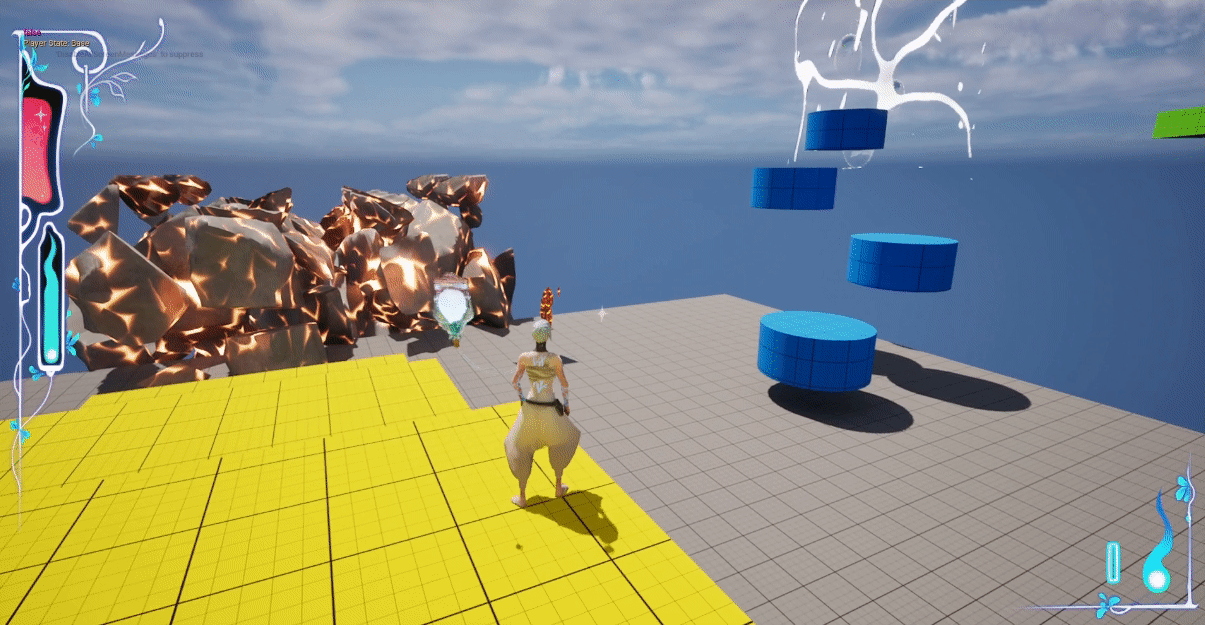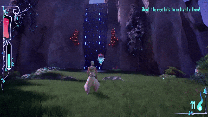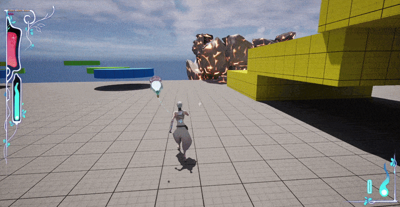 As a result, the player combat was seamlessly integrated with the core gliding mechanic. Players were able to engage in combat while gliding through the level, defeating enemies and activating interactive crystals. The aim assist and zoomed aiming mechanics provided players with subtle aid, which was especially beneficial to controller users. The combat remained quite simple as the game is only a demo, and new players already have the challenge of learning how to glide and attack. This also enabled the goal of showing off the world and assets that the visual art students made, as the gameplay was a bit more laid back.